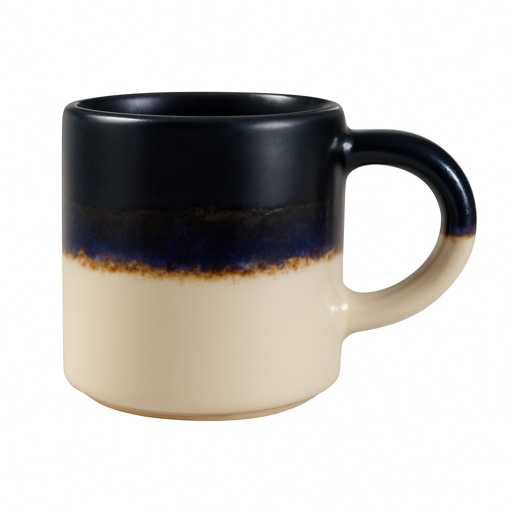 Hecha a mano por Kaolin Cerámica en Puebla, México. Diseño bicolor en negro, con acabado único y tamaño ideal para café americano. Cada pieza es irrepetible, como tu ritual matutino. Capacidad: 250 ml