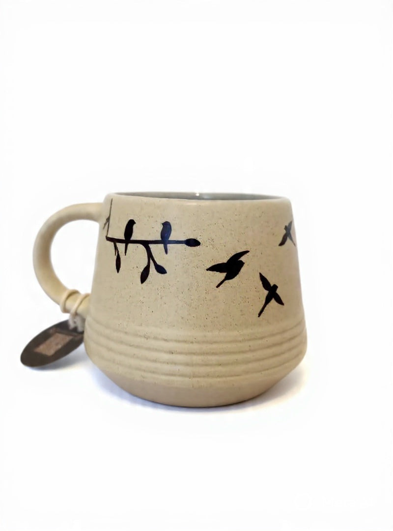 Hecha a mano por el Taller Artilugios en Guanajuato, México. Color arena con delicados dibujos de aves que evocan libertad y ternura, con un acabado suave y natural que resalta su carácter único, convirtiendo la pieza en un símbolo de compañía y alegría cotidiana. Capacidad: 580 ml